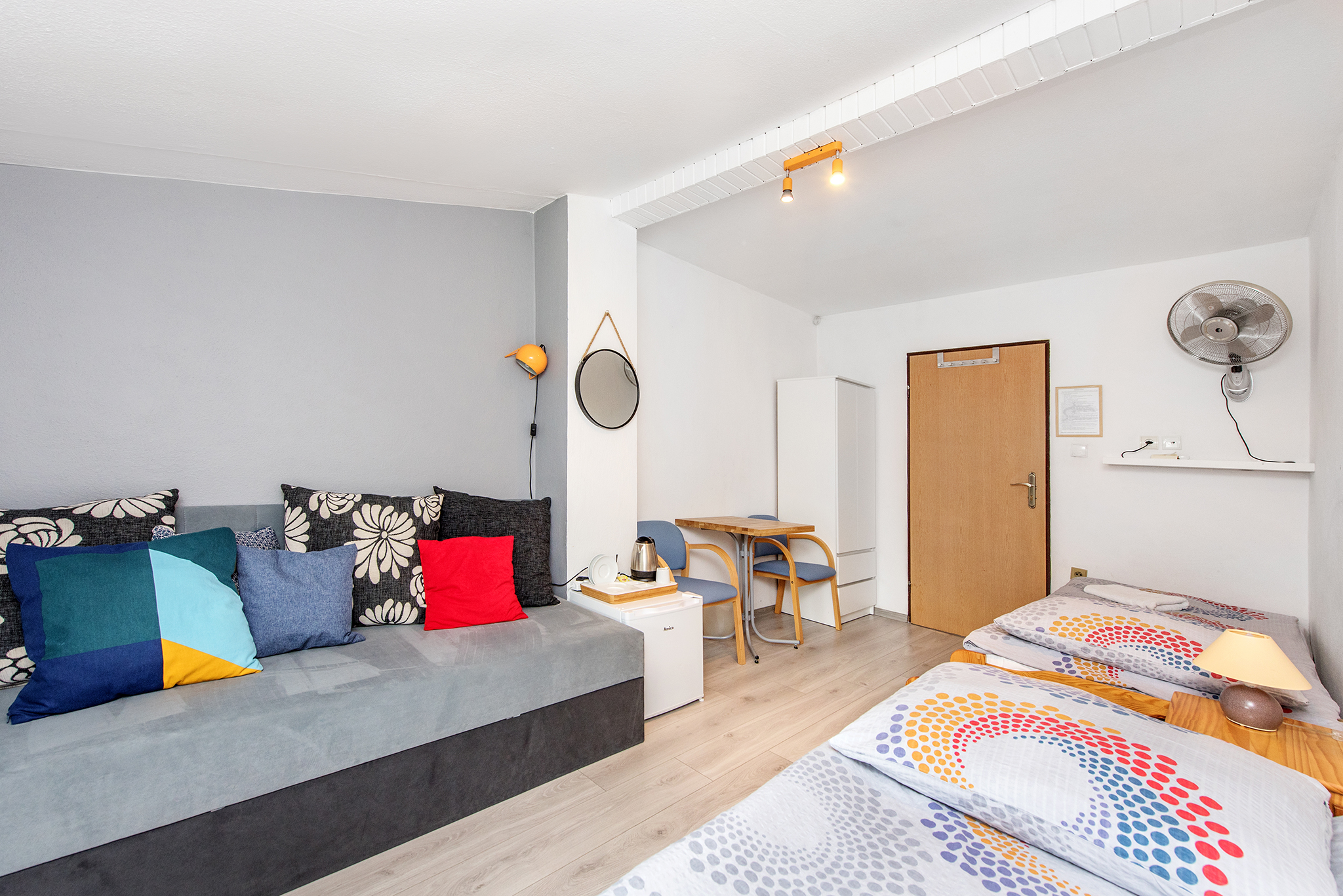 Przytulny i funkcjonalny pokój dwuosobowy z możliwą dostawką (Łóżka pojedyncze), idealny dla osób szukających komfortowego noclegu w przystępnej cenie. Pokój ma ekspozycję zachodnią, z widokiem na ogród i plac zabaw, co czyni go doskonałym wyborem dla gości na 1 noc.