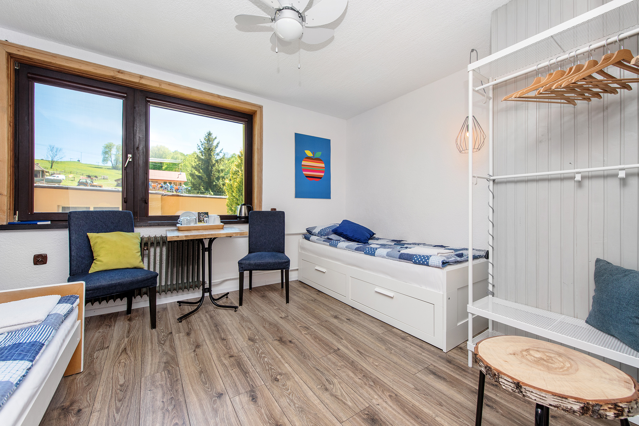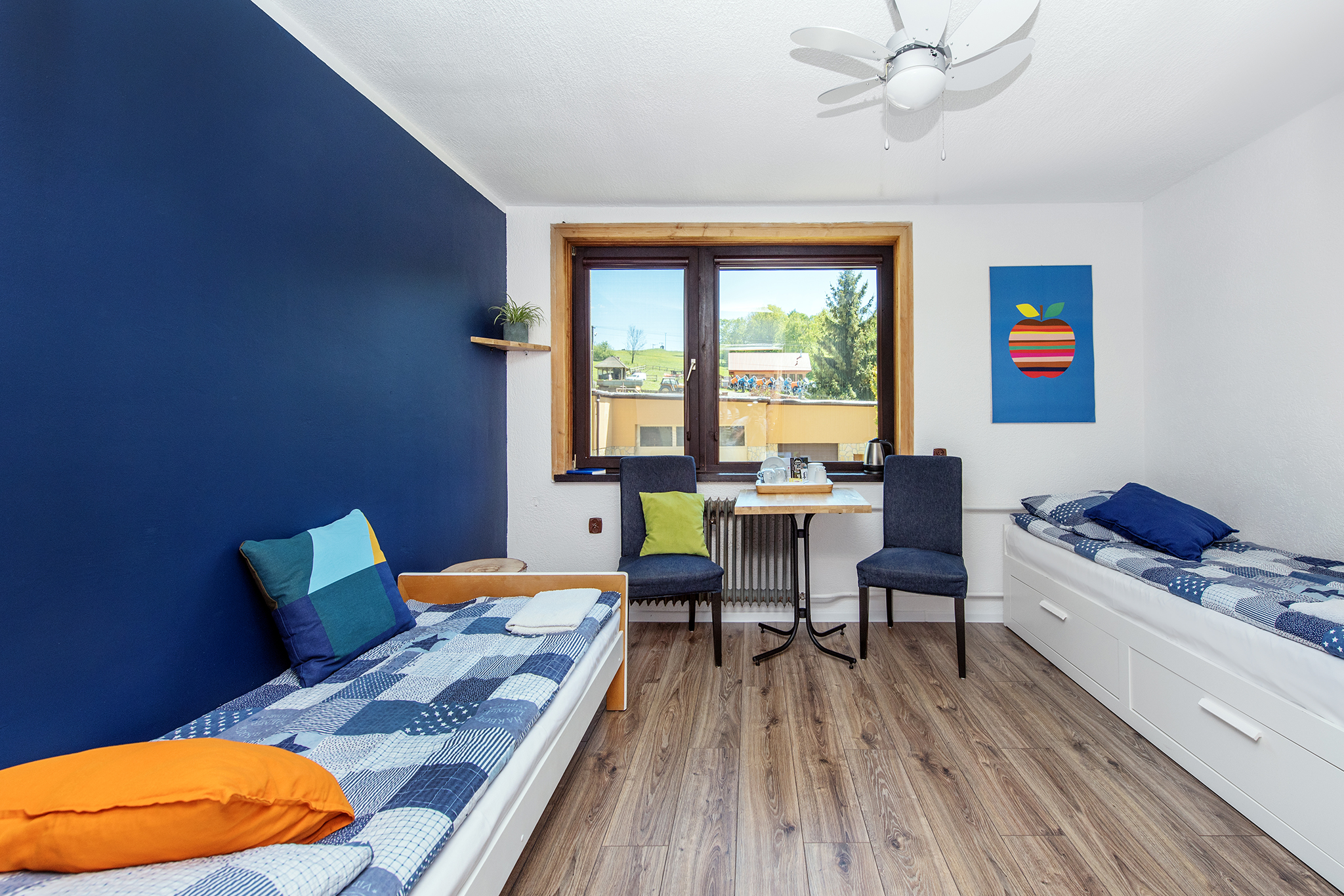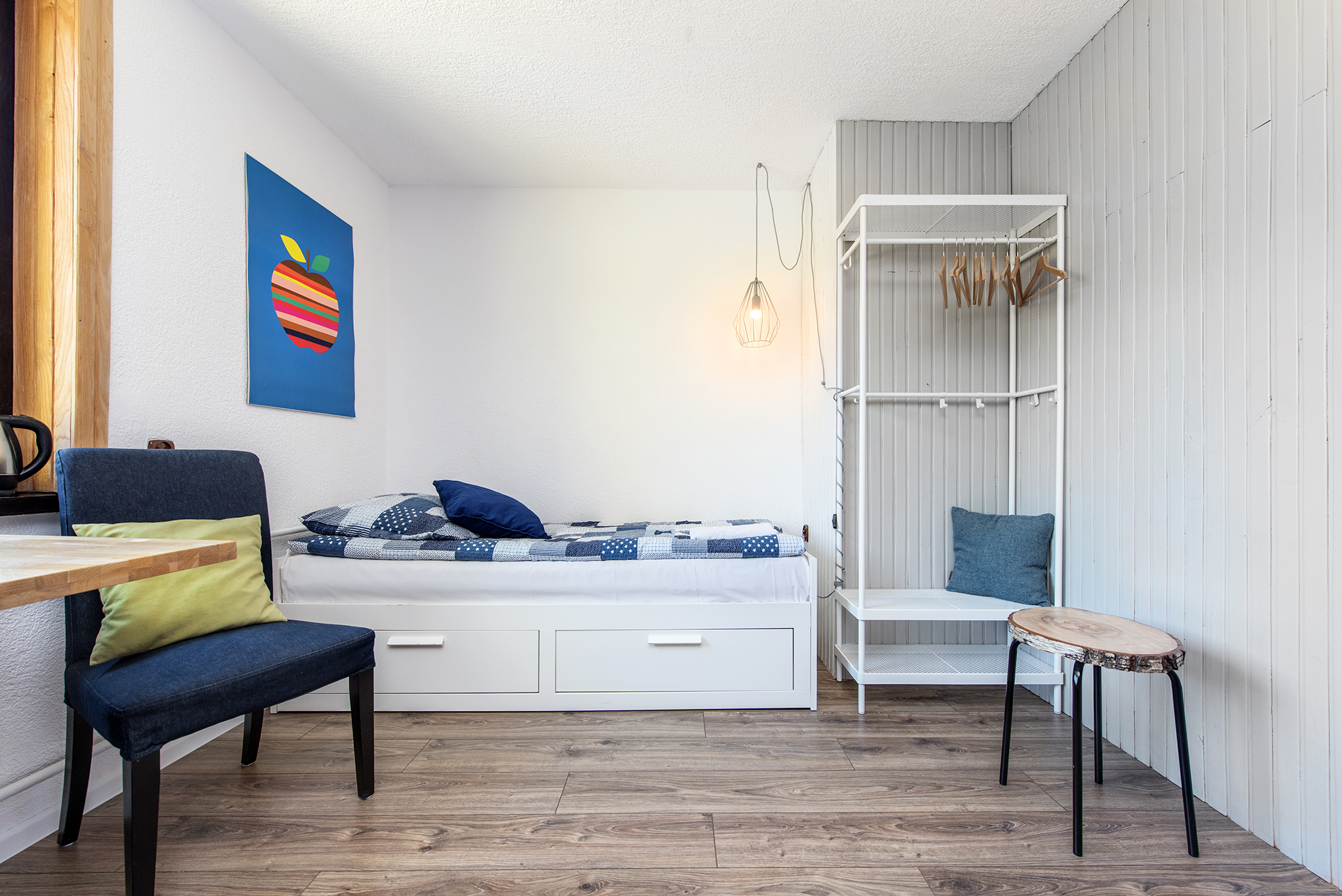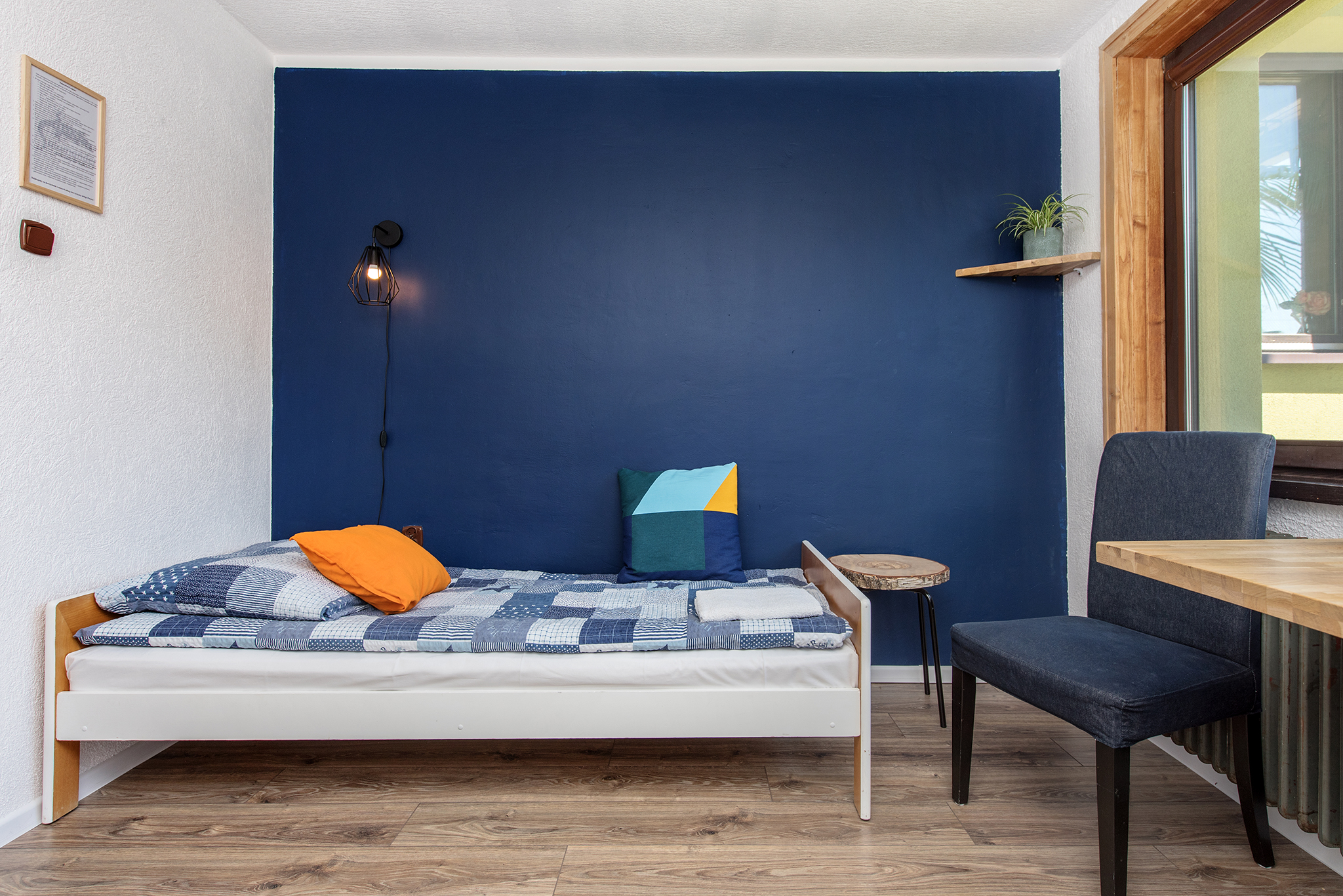 Przytulny, jasny pokój jednoosobowy z południową ekspozycją, idealny dla gościa podróżującego solo. Pokój znajduje się na I piętrze budynku, z łatwym dostępem do wspólnych sanitariatów przeznaczonych dla pokoi ekonomicznych, które mieszczą się piętro wyżej. Dzięki dużemu oknu pokój jest dobrze doświetlony, z widokiem na ogród i otaczającą zieleń.