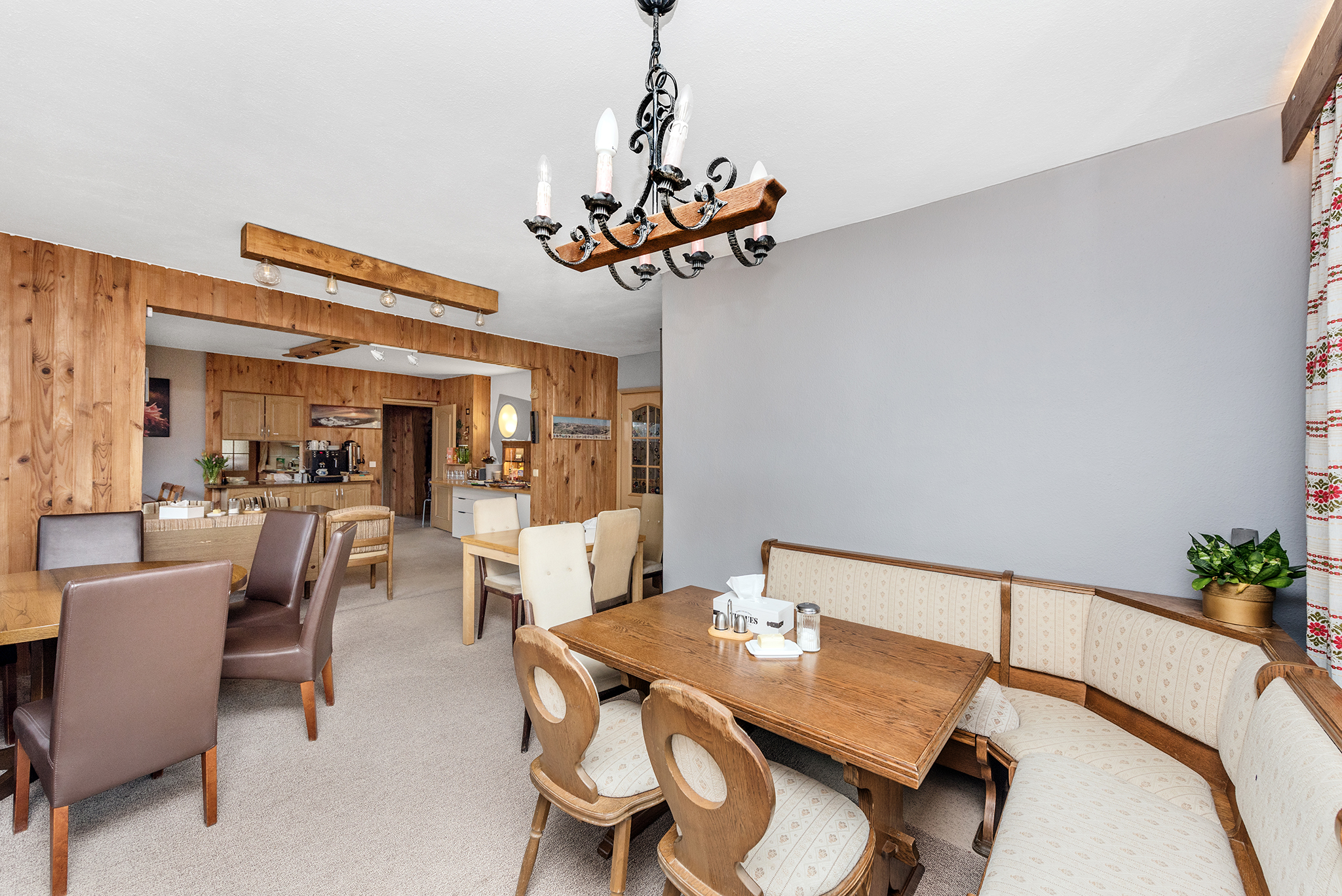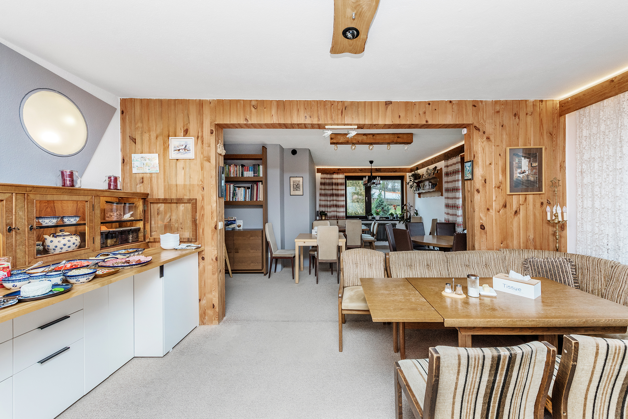Przytulne, stylowe wnętrze utrzymane w klimacie rustykalnym – z drewnianymi elementami i miękkimi tapicerowanymi siedziskami. Jadalnia to miejsce, gdzie codziennie serwujemy śniadania w formie bufetu oraz obiadokolacje (tylko w sezonie zimowym), a nasi goście mogą wspólnie zasiąść do stołu, napić się porannej kawy lub zjeść coś pysznego w domowej atmosferze. Na miejscu znajduje się ekspres do kawy, wybór herbat i biblioteczka.