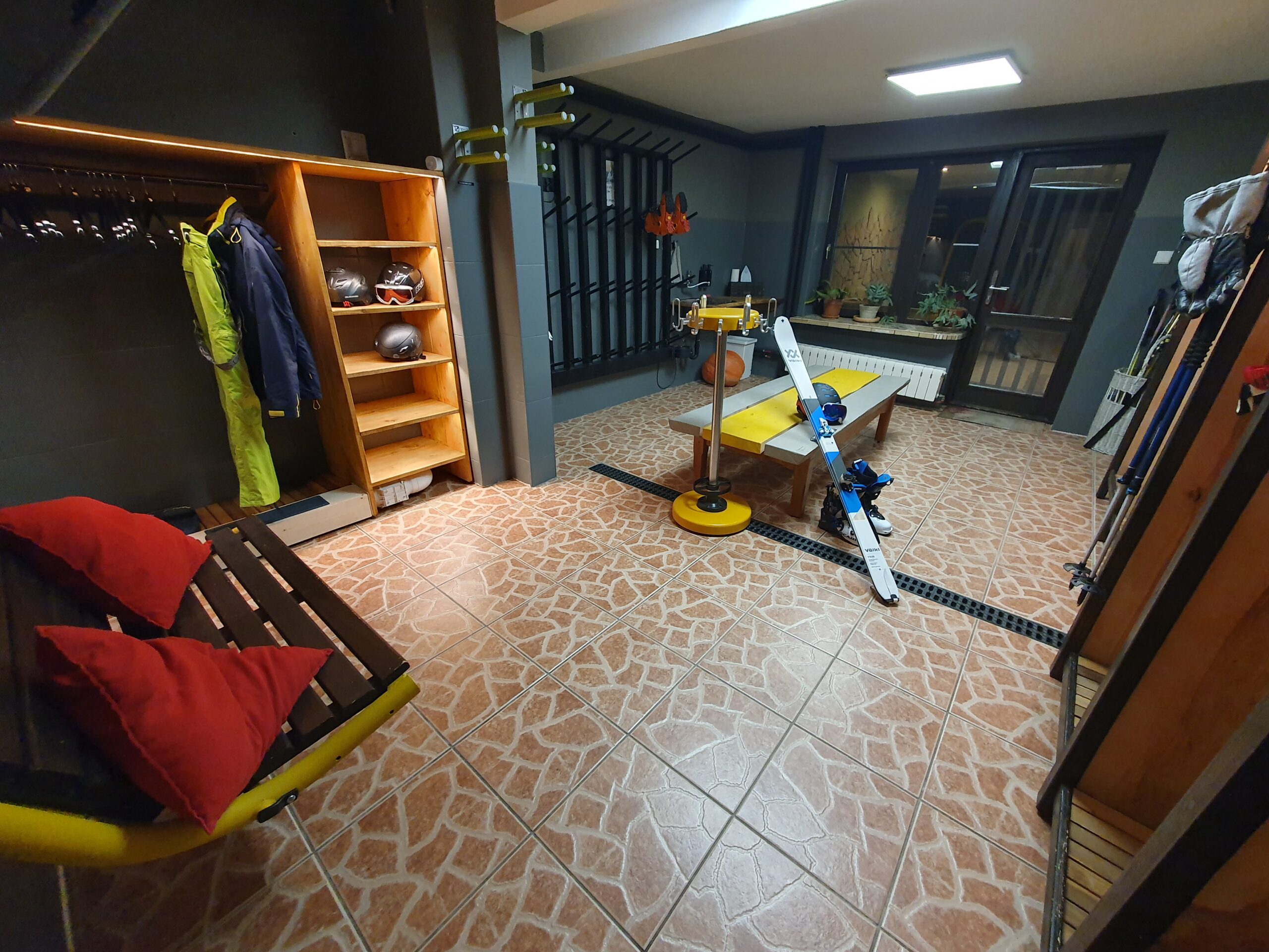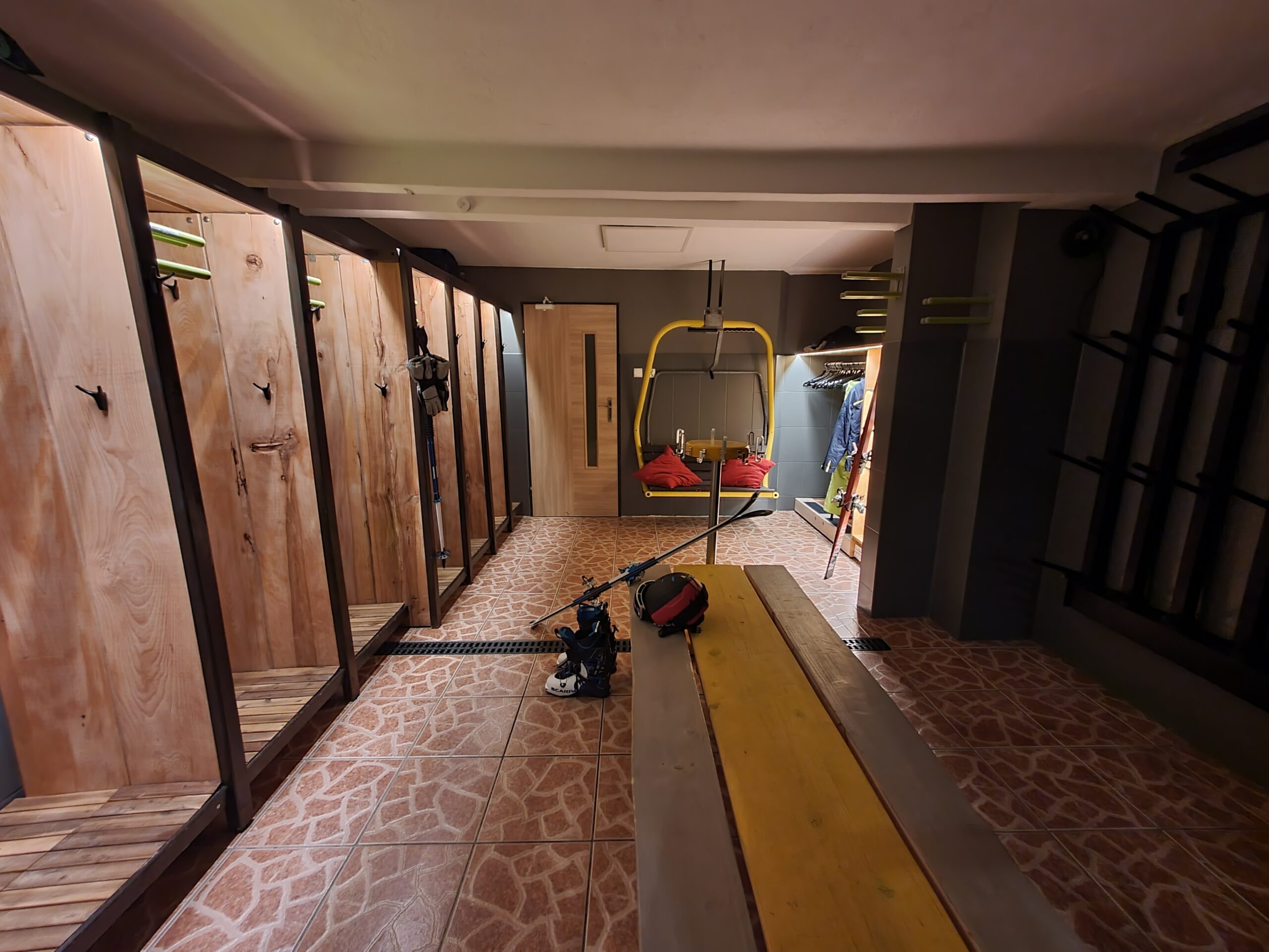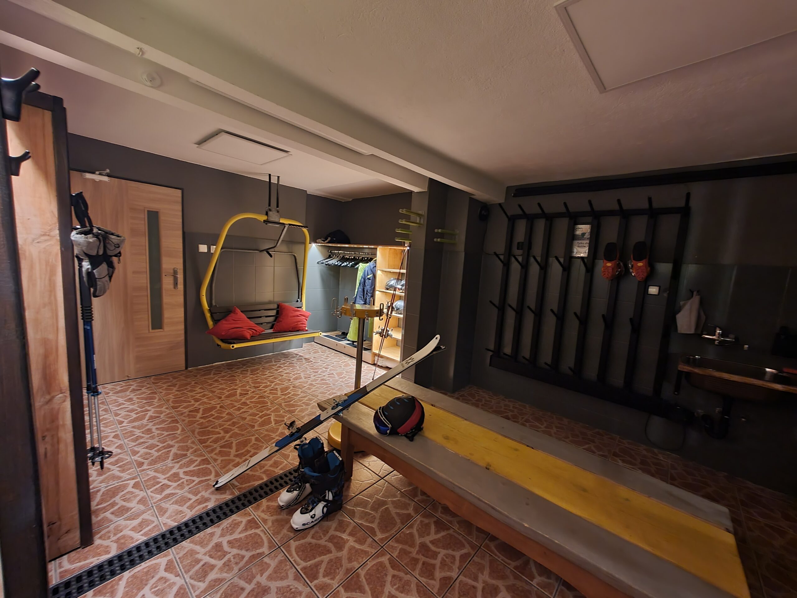 - Drewniane boksy przypisane do pokoju na narty i sprzęt