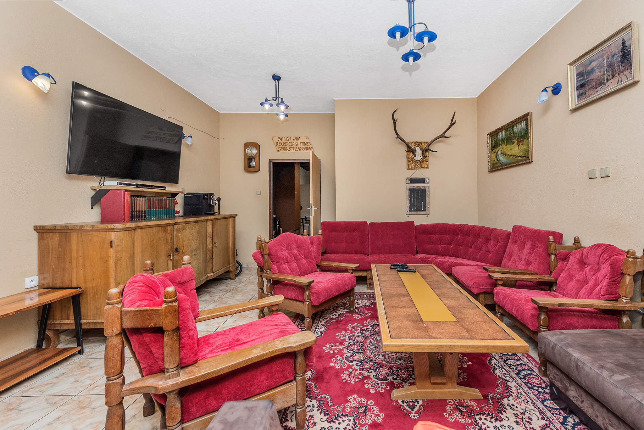 Salon wypoczynkowy w klimacie górskiego schroniska – z wygodnymi kanapami, dużym stołem kawowym i telewizorem. To idealne miejsce na wieczorne rozmowy, planszówki, książkę przy filiżance herbaty lub relaks po dniu na szlaku.